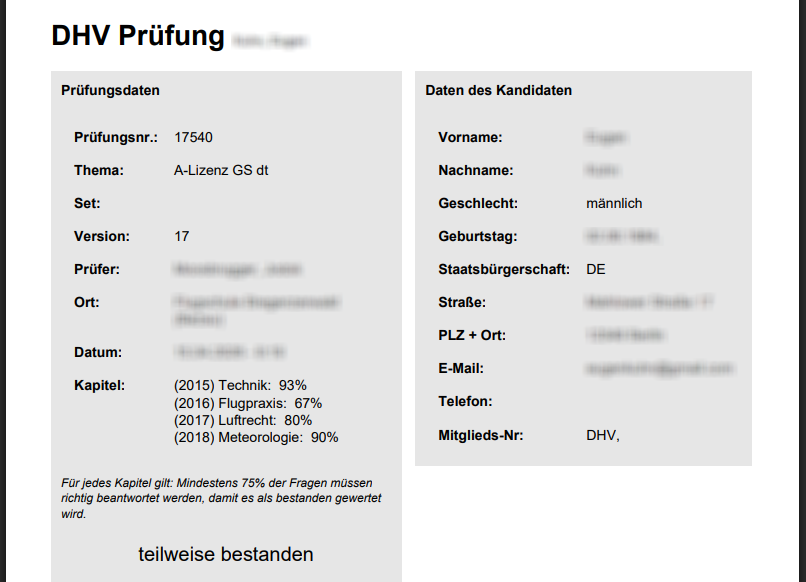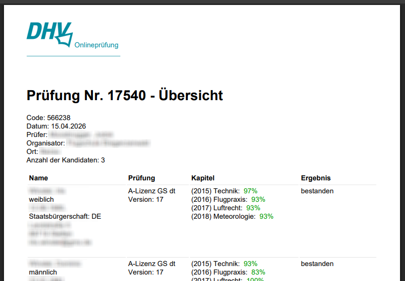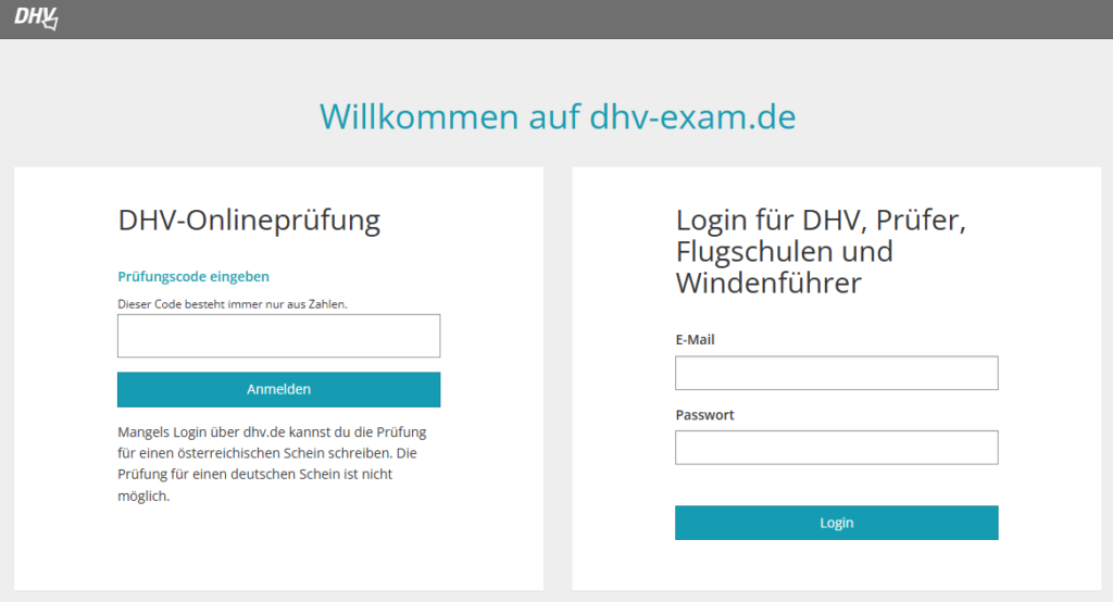 Das oben Stehende bezieht sich auf Kandidaten für einen österreichischen Schein. Kandidaten für den deutschen Schein gehen etwas anders vor: Sie loggen sich zuerst im DHV-Serviceportal ein und wechseln von dort mittels Button automatisch auf unsere Prüfungsplattform. Sie wählen nur den Schein aus und gelangen direkt ins Wartezimmer. Es ist kein Problem, Kandidaten für österreichische und deutsche Scheine gemeinsam in einer Prüfungsveranstaltung zu haben.