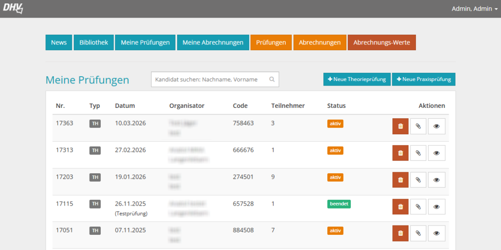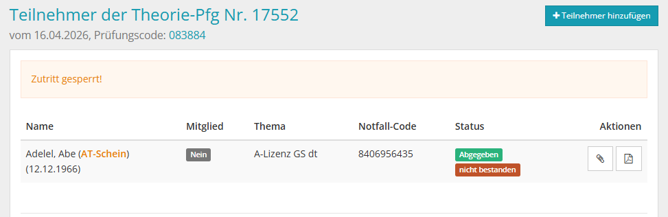 Außerdem kann man über den Auge-Button in die Prüfung hineingehen und sich eine Liste der Teilnehmer (einschließlich Daten wie zBsp. Prüfungserfolg) anzeigen lassen.