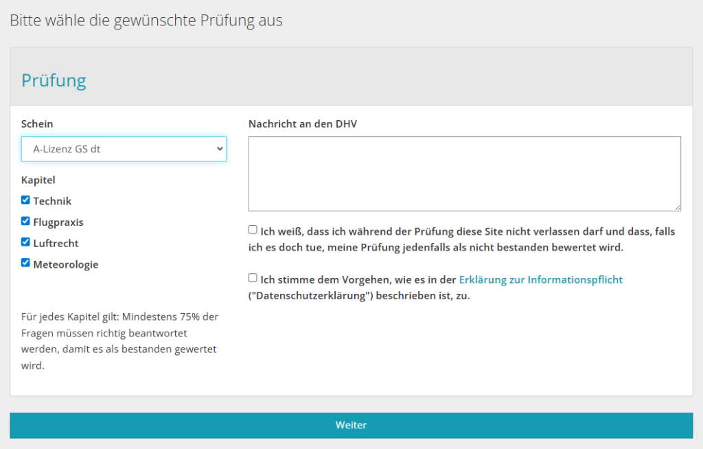 Es ist besonders wichtig, dass diese Auswahl korrekt ist, da die Prüfung andernfalls (zBsp. falls Überlandberechtigung statt Pilotenschein gewählt wurde) abgebrochen und neu gestartet werden muss.