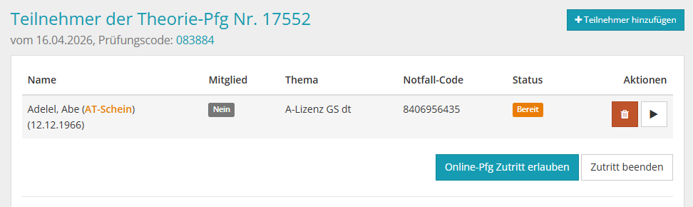 Welche Kandidaten noch mit der Dateneingabe beschäftigt sind bzw. ob bereits alle Kandidaten im Wartezimmer sind, siehst du in der Prüferansicht in deiner Liste der Prüfungskandidaten. Ist letzteres der Fall, kannst du die Prüfung per Klick auf einen Button starten.