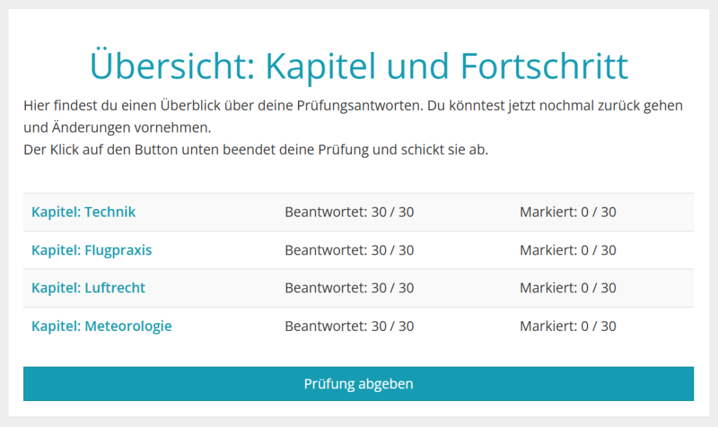 Jede Prüfung wird zufällig erstellt. Sobald etwa die Hälfte der Fragen beantwortet ist, kann der Kandidat ins nächste Kapitel wechseln. Nachdem er alle Kapitel durchlaufen hat, gelangt er zu einer Übersicht, von der aus er in bereits bearbeitete Kapitel zurückspringen kann. Das ist sinnvoll, wenn der Kandidat Antworten kontrollieren oder sich bei einzelnen Fragen noch entscheiden möchte.